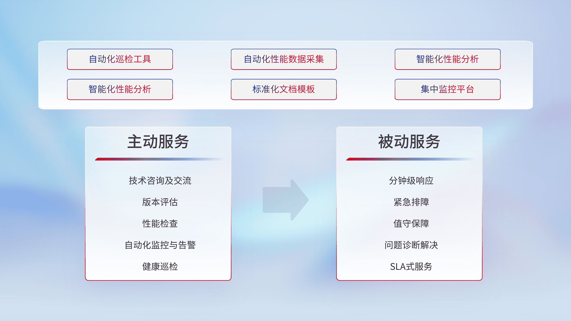 智能化工具和标准化文档,,,保障服务质量,,提供主动服务(包含技术咨询、、、版本评估、、、、性能检查、、、自动化监控与告警、、、健康巡检)和被动服务包含(分钟级响应、、紧急排障、、值守保障、、、问题诊断解决、、SLA服务)。。。