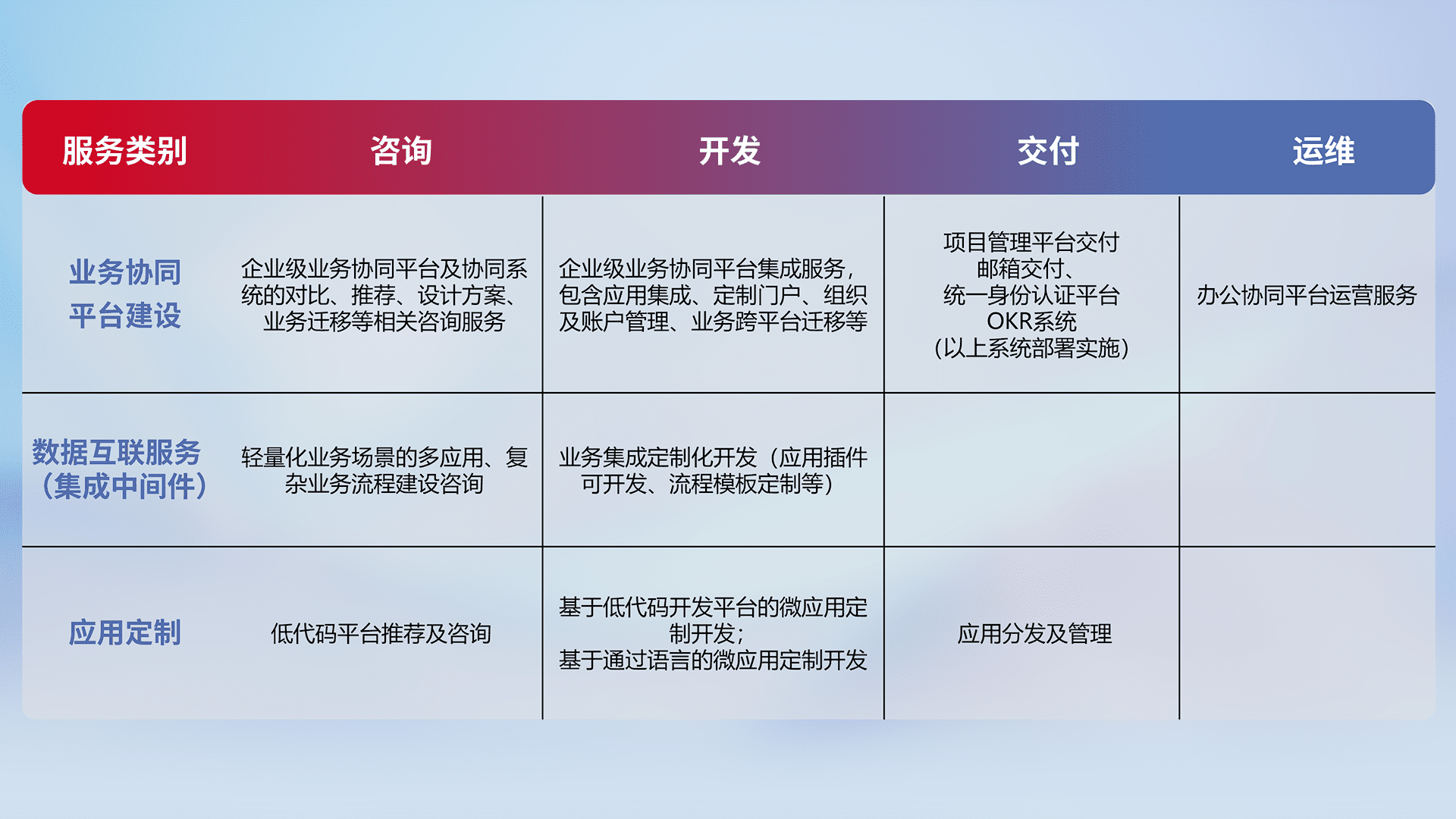 针对钉钉、、、、企微、、、、IDaas等平台级产品提供产品的规划、、、、方案、、、交付、、、定制化开发等服务,,,,实现如统一协同办公、、智能客户服务、、、混合会议管理、、智能数据查询、、等业务场景,,实现数字化转型。。